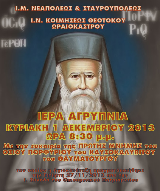 Η Ενορία Κοιμήσεως Θεοτόκου Ωραιοκάστρου, με πολύ συγκίνηση, ανακοινώνει ότι την Κυριακή 1 Δεκεμβρίου 2013 και ώρα 8:30 μ.μ. θα τελέσει ιερά Αγρυπνία με την ευκαιρία της ΠΡΩΤΗΣ ΜΝΗΜΗΣ του Οσίου Πατρός ημων Πορφυρίου του Καυσοκαλυβίτου και Θαυματουργού.